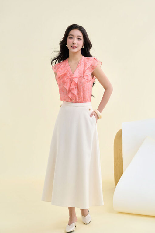 - Sơ mi sát nách phối bèo, đính nút nổi bật hoặc chi tiết đắp vai: Thêm điểm nhấn cho những nàng yêu sự nữ tính, nhẹ nhàng.