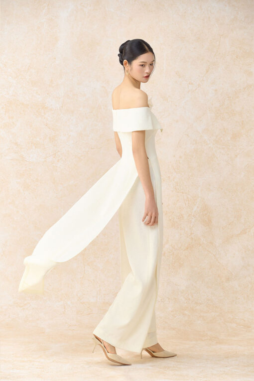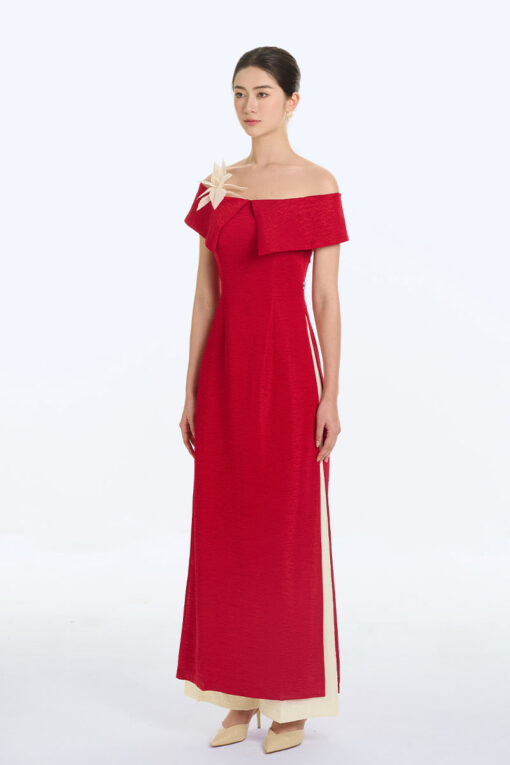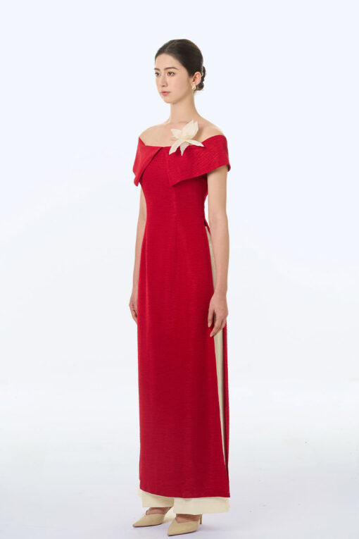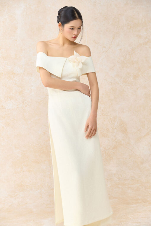 Bộ áo dài cách tân trễ vai ngực cài hoa