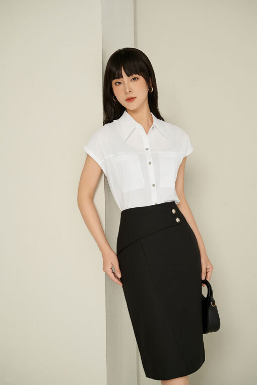 Áo sơ mi trắng cổ đức + Chân váy bút chì đen + Giày cao gót basic