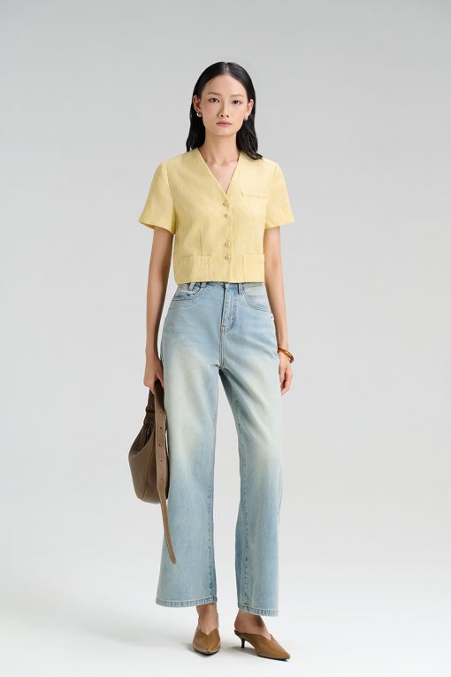 Quần jeans ống đứng + Áo sơ mi cổ V + Giày slingback