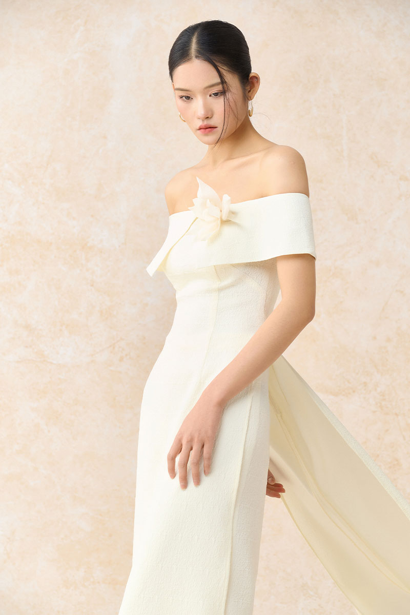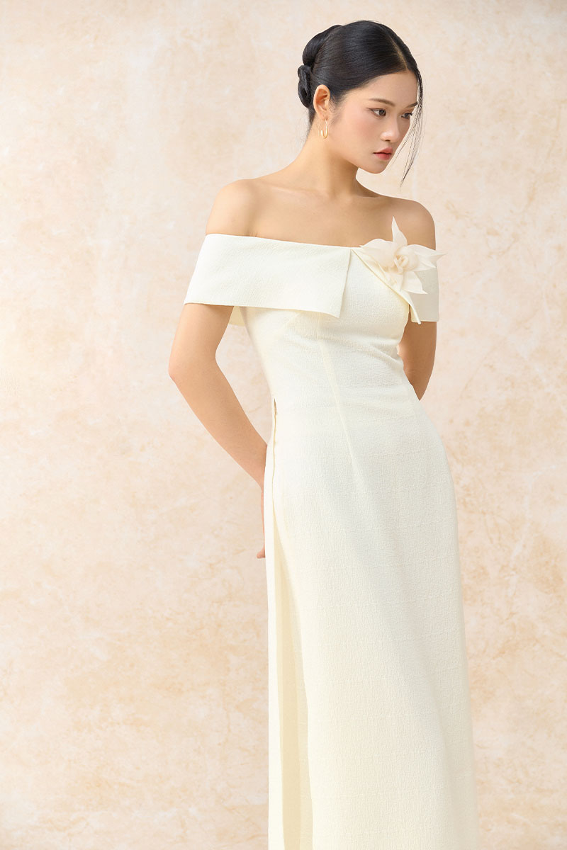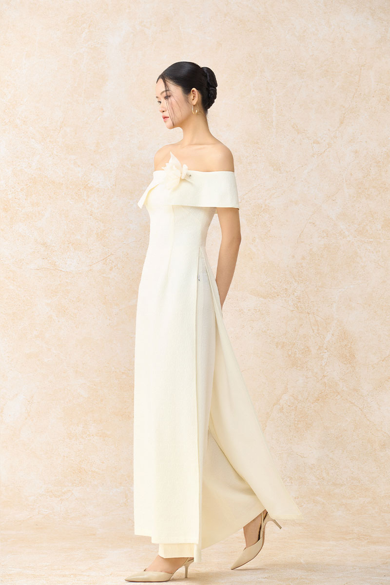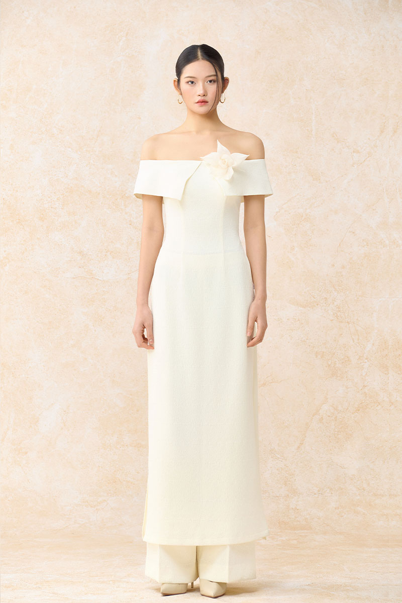 Bộ áo dài cách tân trễ vai ngực cài hoa