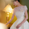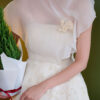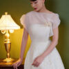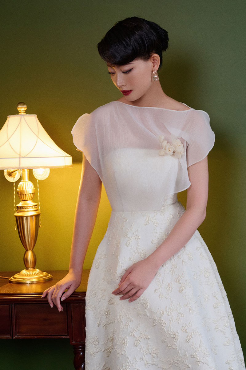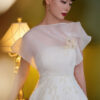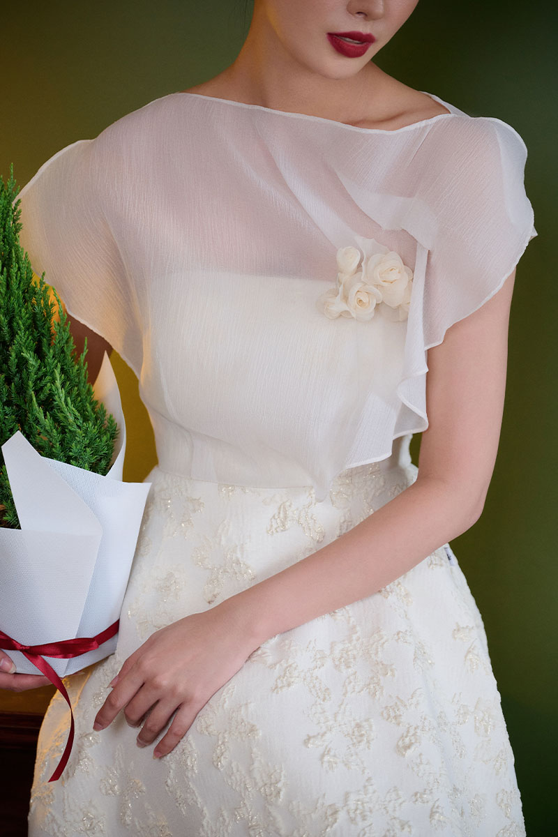 Đầm tiệc phối lệch vai hoa cài ngực