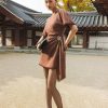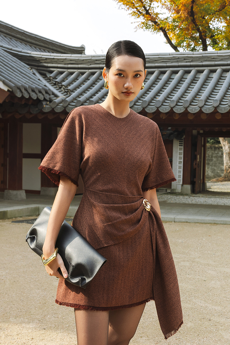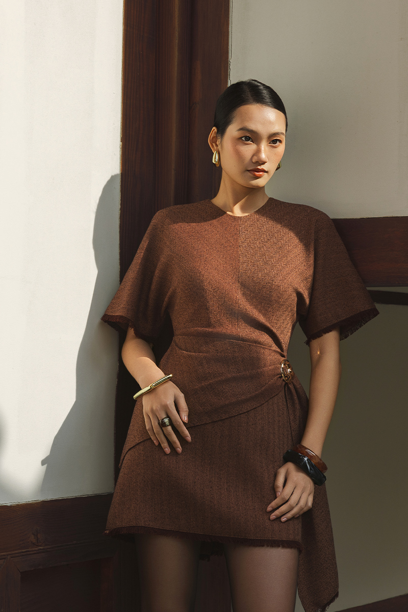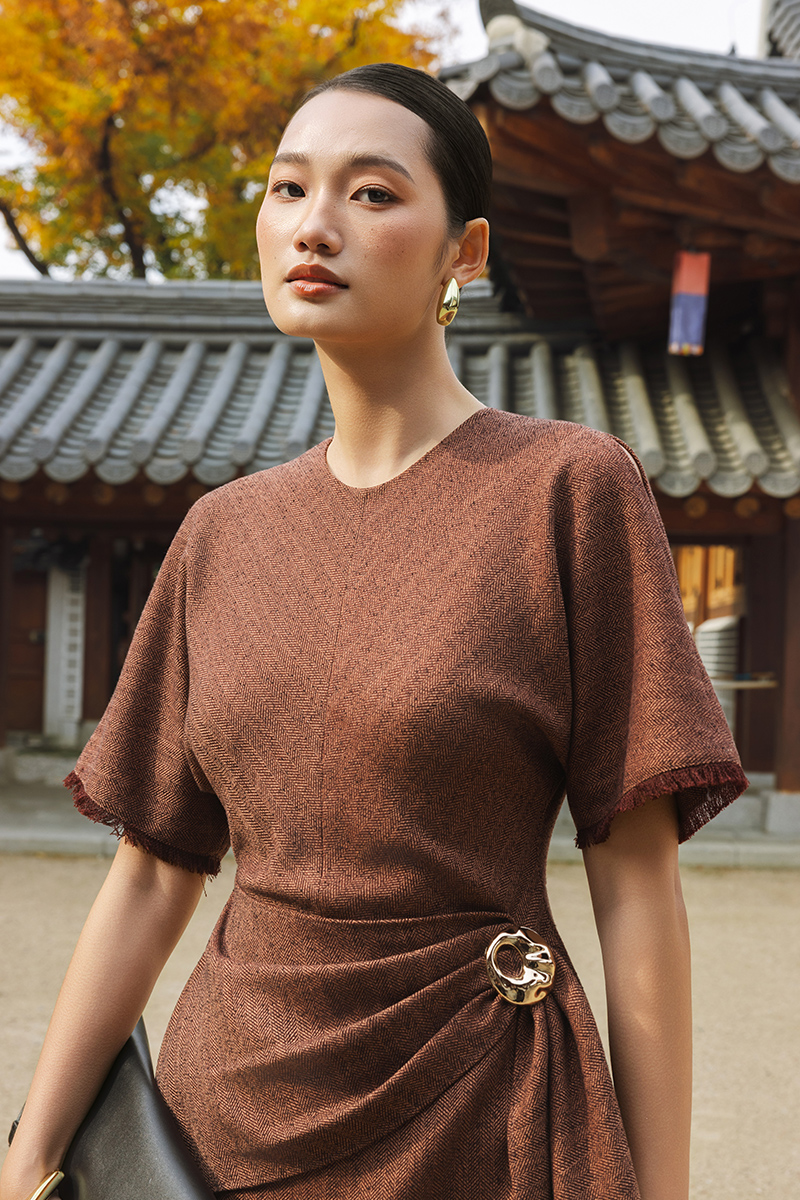 Đầm tweed A tay cánh dơi, vạt bong xếp ly