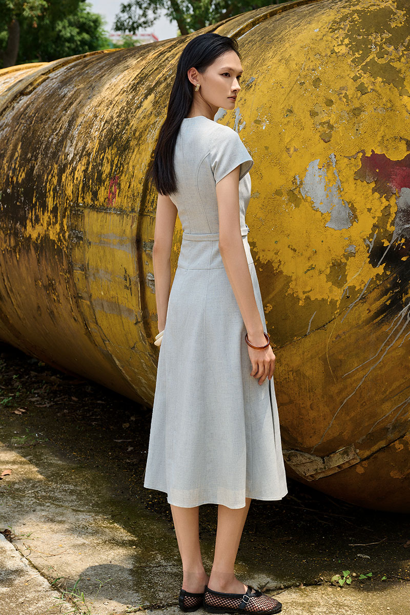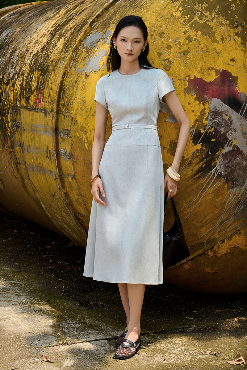 Đầm xoè cổ tròn can hông xếp ly gấu