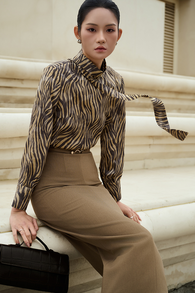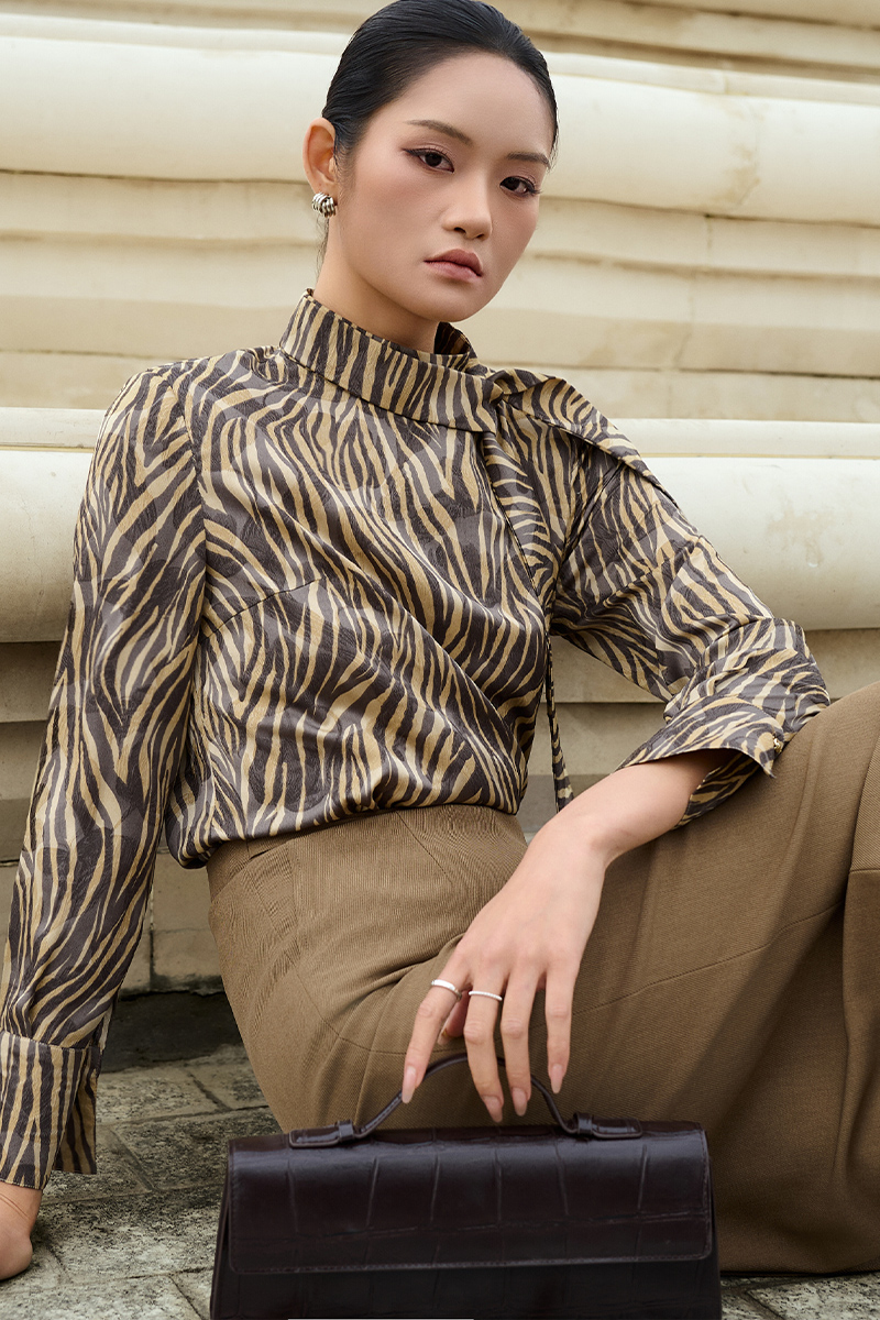 Sơ mi DT hoạ tiết cổ cao, buộc nơ