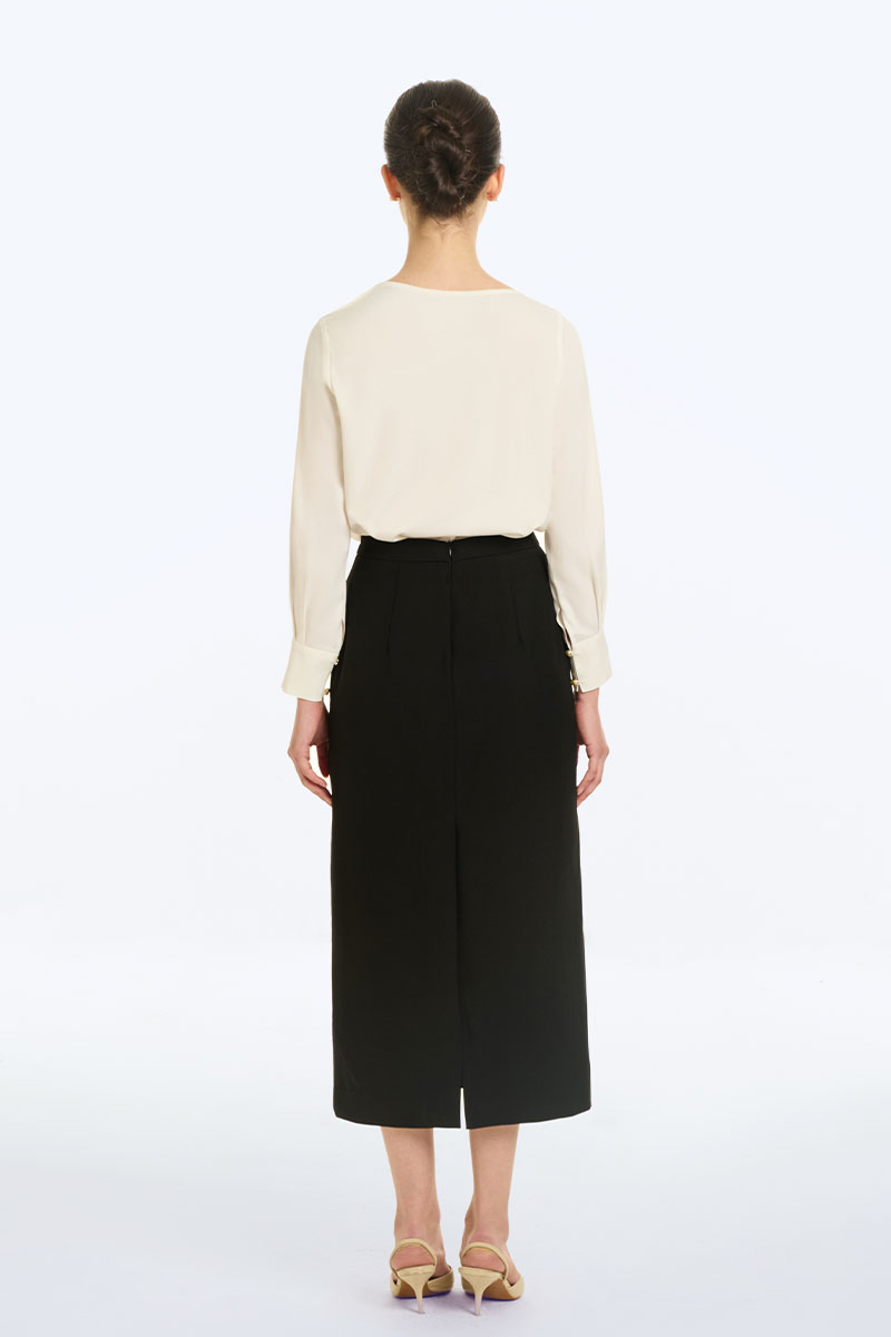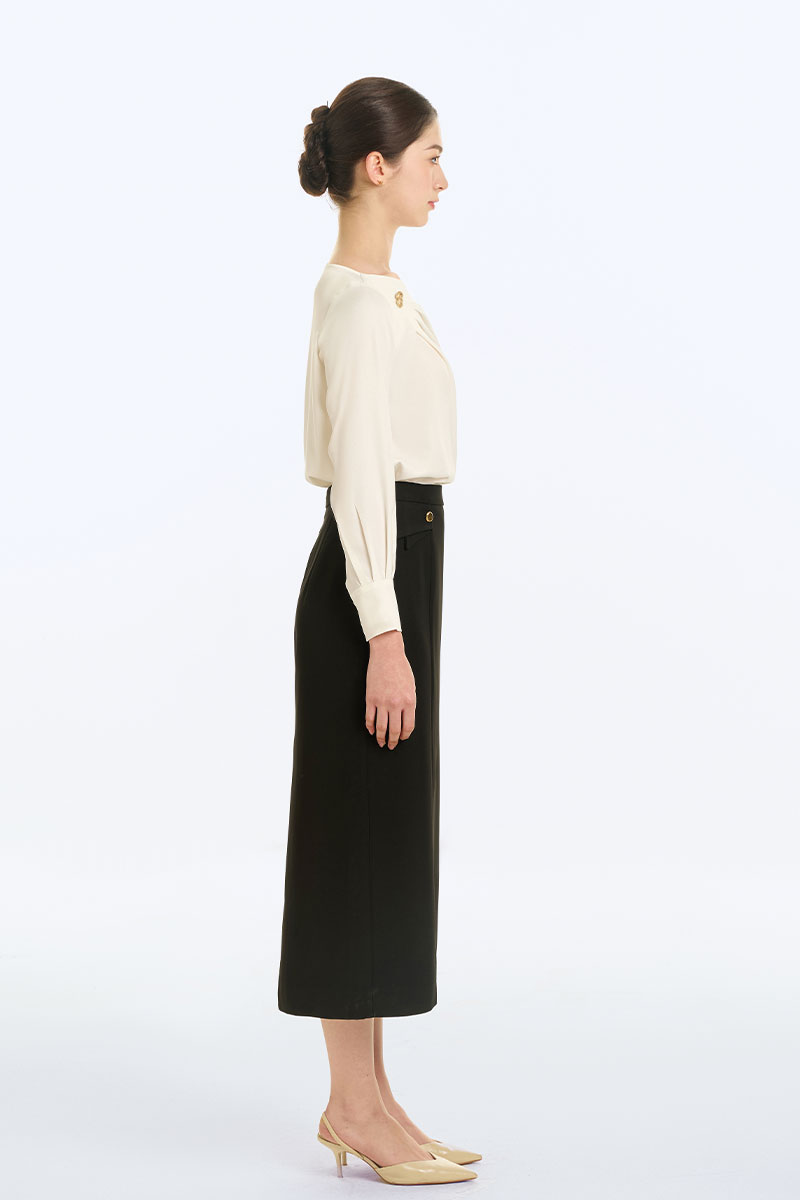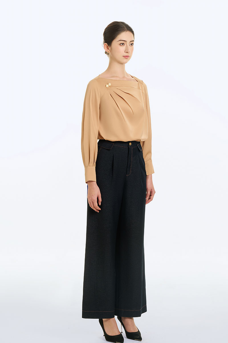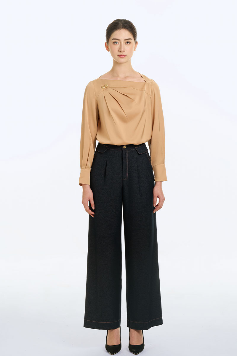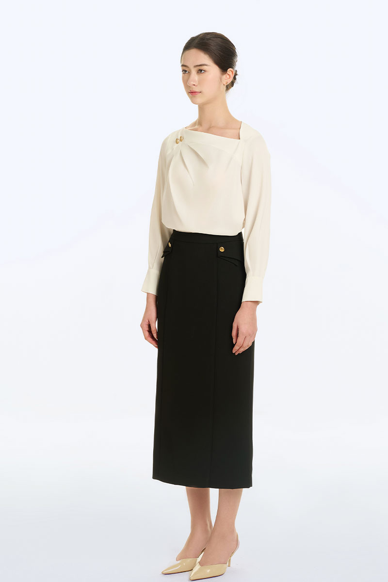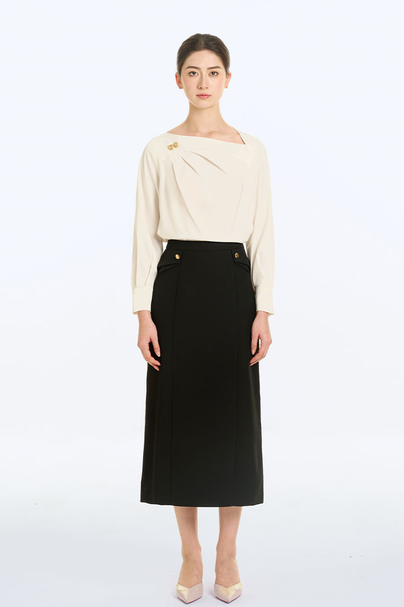 Sơ mi DT lệch vai ngực xếp ly đính cúc