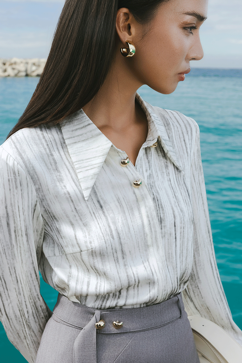 Sơ mi DT hoạ tiết cổ đính cúc trang trí