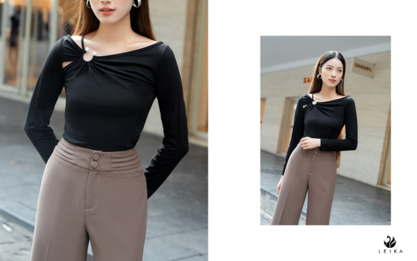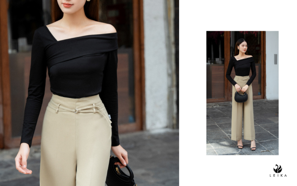 Basic nhưng không kém phần sang trọng, áo thun ôm DT vạt vai lệch tạo điểm nhấn cách điệu một cách tinh tế, giúp các quý cô tự tin khoe chọn xương quai xanh. Bên cạnh đó, chất vải co dãn 4 chiều cùng tông màu sắc cơ bản là kem và đen đang khiến loại áo này trở thành sản phẩm best seller của LEIKA.