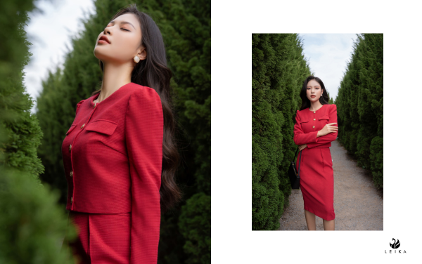 Bạn có thể kết hợp set váy áo này với một chiếc áo khoác dạ cùng chất liệu hoặc khác màu để tạo điểm nhấn. Đừng quên phụ kiện như mũ, khăn quàng, túi xách hay giày cao gót để hoàn thiện phong cách của bạn.