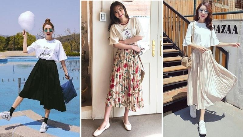 Áo thun phối với chân váy xếp ly dáng dài
