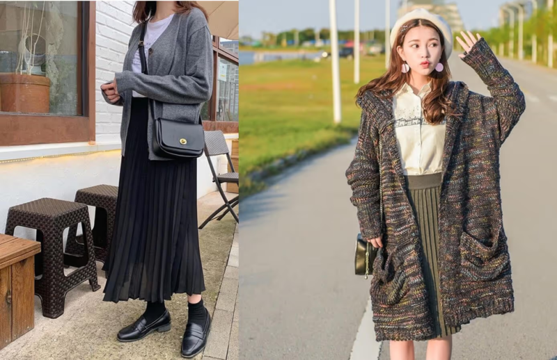 Áo cardigan phối với chân váy xếp ly dáng dài