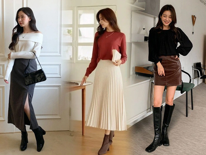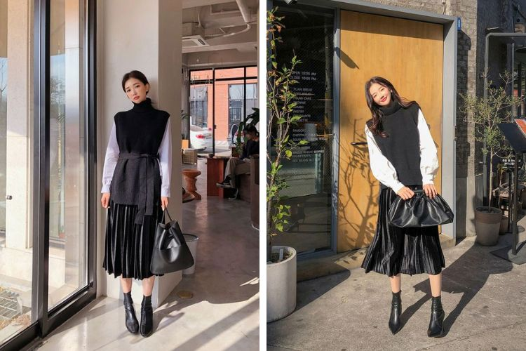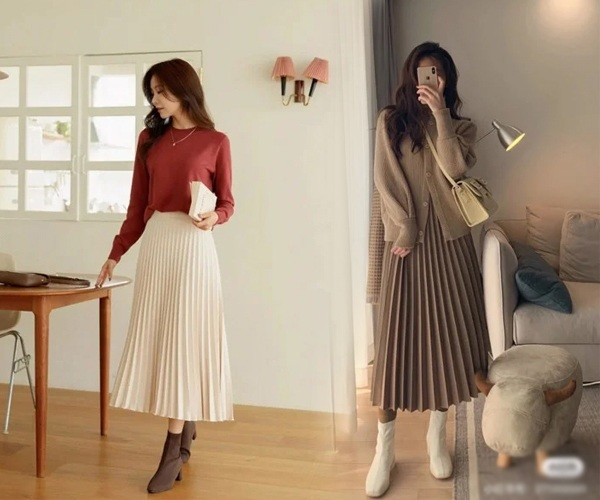 Áo len phối với chân váy xếp ly dáng dài