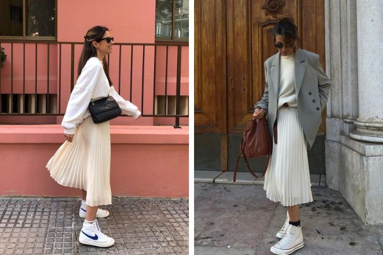 Phối đồ với chân váy xếp ly dáng dài bằng giày thể thao
